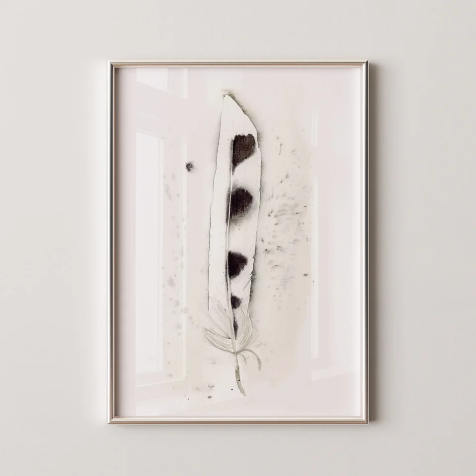 In creating this painting, I embraced the gentle dance of grays and soft blacks against the white background, letting the feather take center stage. I used delicate brushstrokes and subtle layering to capture the intricate patterns and natural curves, allowing the delicate transitions and soft, blurred edges to reflect a sense of quiet assurance. The gentle splatters and drips add movement and spontaneity, inviting a feeling of calm predictability and warmth, like a gentle whisper from nature. — Shayna, March 2023