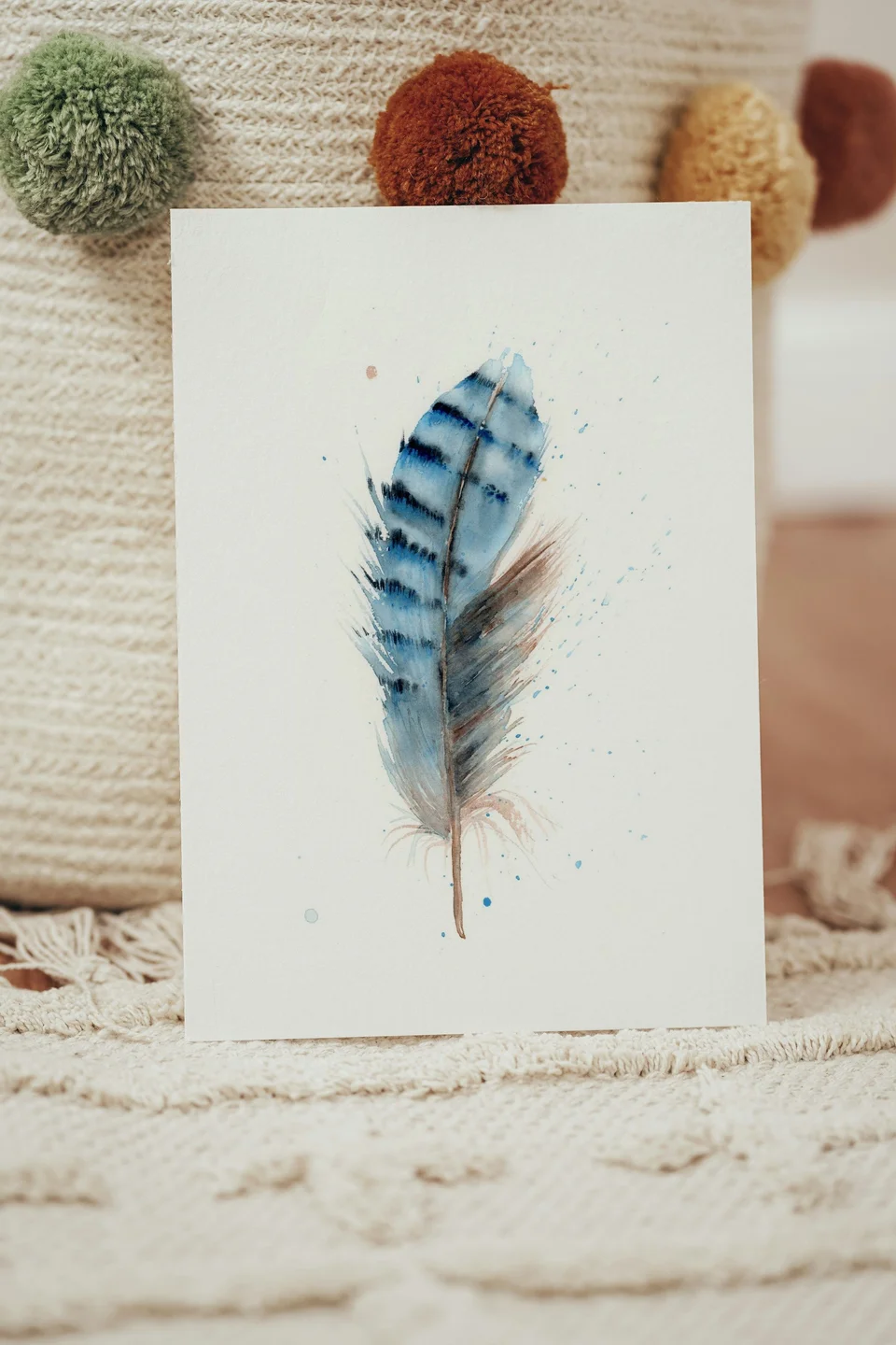In this painting, I chose a soothing blend of soft blues and earthy browns to bring a feather to life on the canvas. My brushstrokes were gentle yet deliberate, using delicate washes to capture the subtle gradations and natural texture of each feather strand. The light splatters and drips around the feather suggest movement and energy, grounding the piece in simplicity while maintaining a focus that draws the viewer in, allowing them to feel anchored and aware in the moment. — Shayna, April 2023