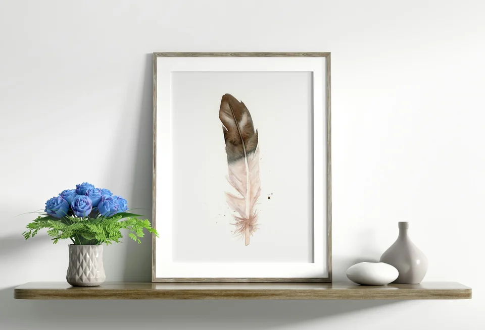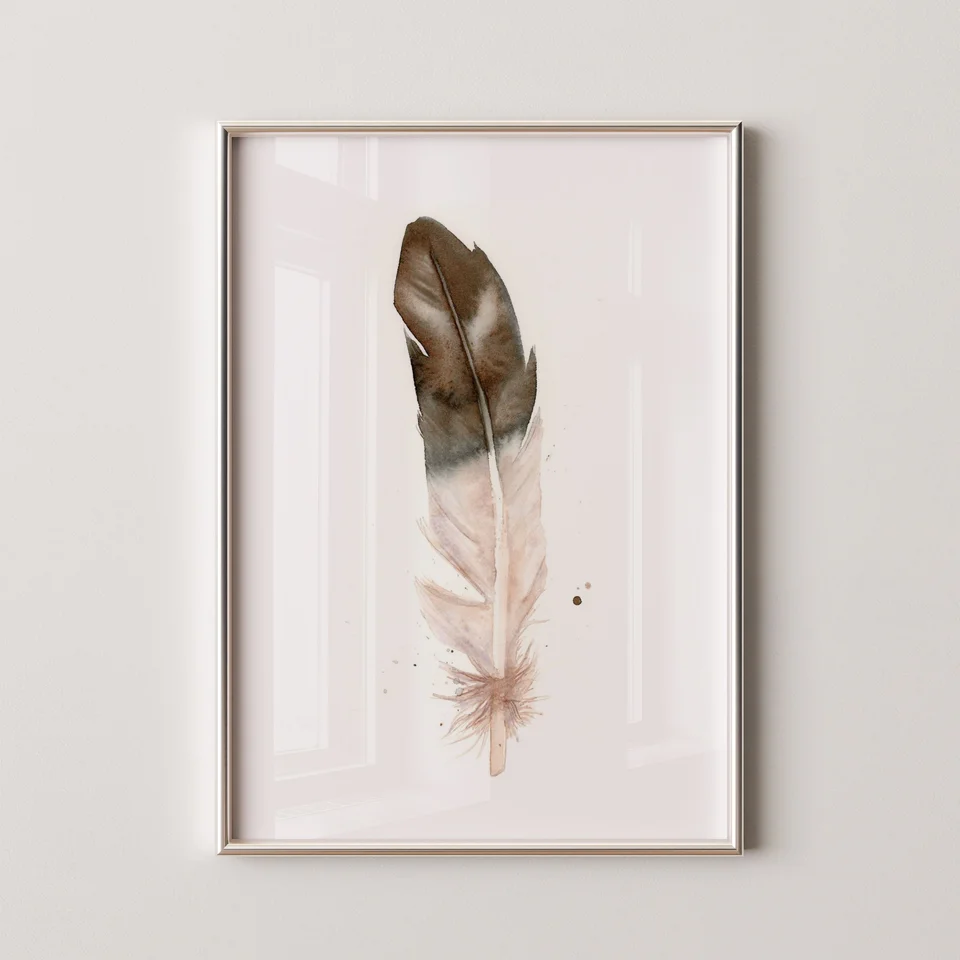 In creating this piece, I chose delicate shades of browns and grays, allowing them to softly blend with hints of white, capturing the gentle essence of the feather. I used a wet-on-wet watercolor technique to achieve smooth transitions, giving the feather a light and airy feel, while the subtle splatters and fine drips add an organic texture. Through these choices, I've aimed to evoke a sense of calm and direction, inviting the viewer to connect with their inner path. — Shayna, May 2023