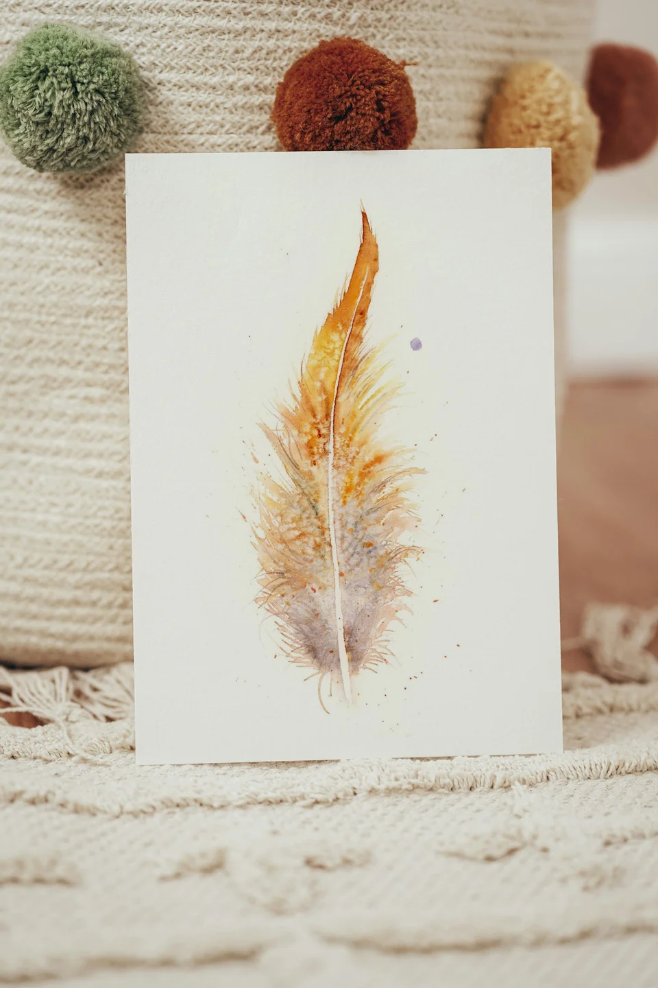 I poured my heart into this feather, letting warm hues of amber and gold flow seamlessly into soft grays and whites. Each delicate stroke and blend captures the feather's subtle grace and quiet strength. As I painted, I felt an undeniable sense of focus—every layer and splash reaching toward a calm yet determined energy within me. — Shayna, May 2023