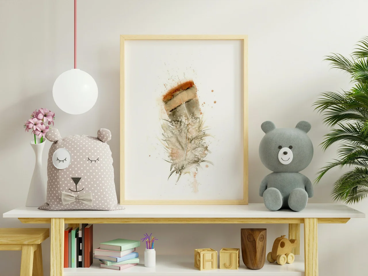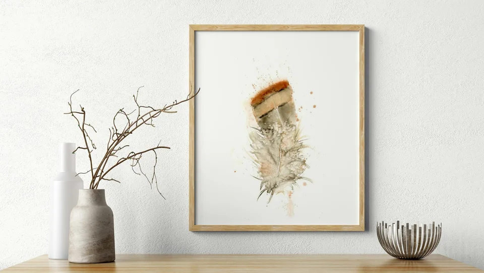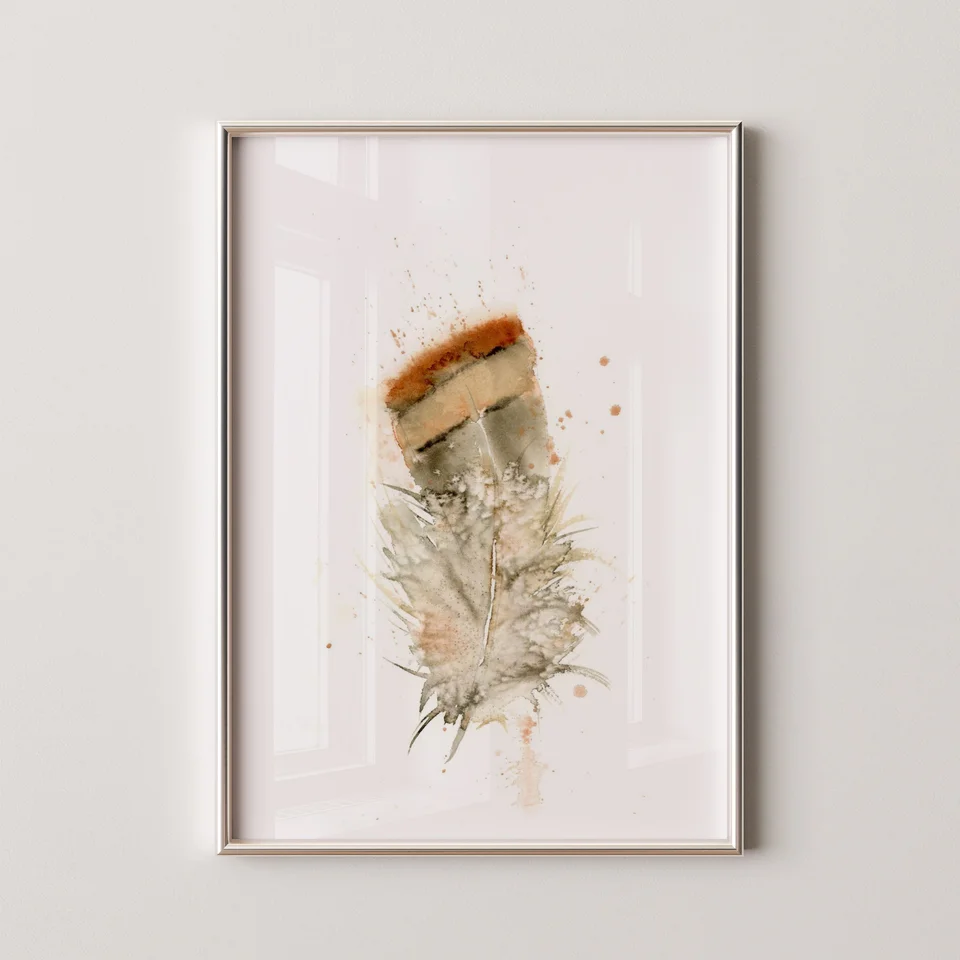 I wanted this painting to feel like a gentle embrace, starting with the warm, earthy brown at the top that fades softly into a delicate, airy gray. My brushstrokes are light, letting the colors bleed and blend naturally, creating a sense of openness and ease. By allowing the paint to splatter and drip, it felt like I was imitating nature itself, making it easy for the viewer to feel warmth and calm in the simple beauty of the feather. — Shayna, July 2023
