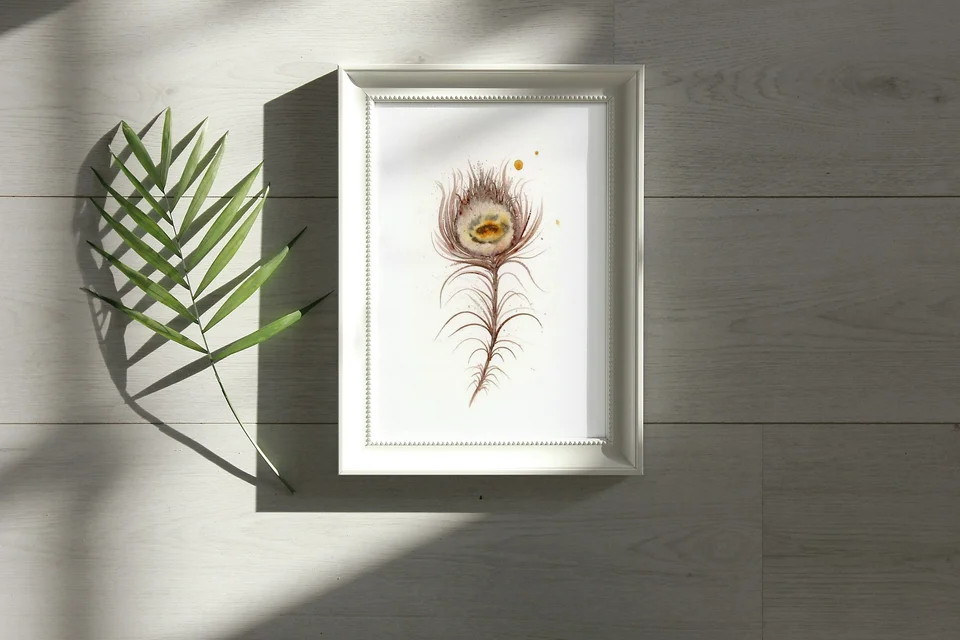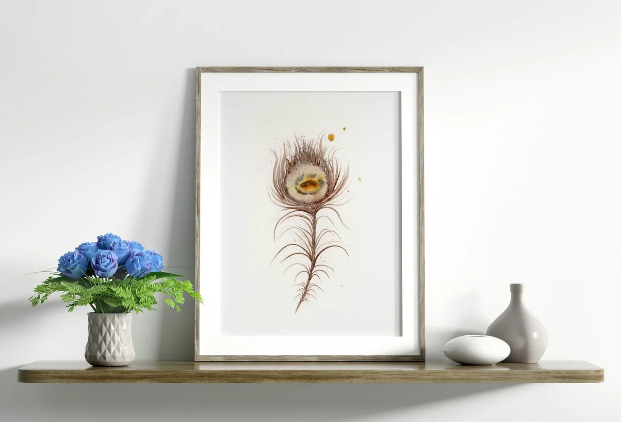 In crafting this piece, I embraced a gentle palette of earthy browns and soft yellows, letting them dance around the feather's eye with delicate washes. The fluid transitions and fine, tapered strokes create a sense of gentle movement that echoes nature’s subtleties. I poured my heart into the layering and blending, allowing each brushstroke to invite a sense of time’s passage and shared history, gently calling to mind those moments we hold dear. — Shayna, July 2023