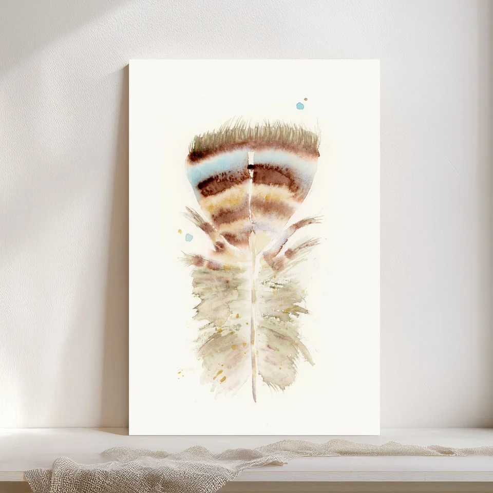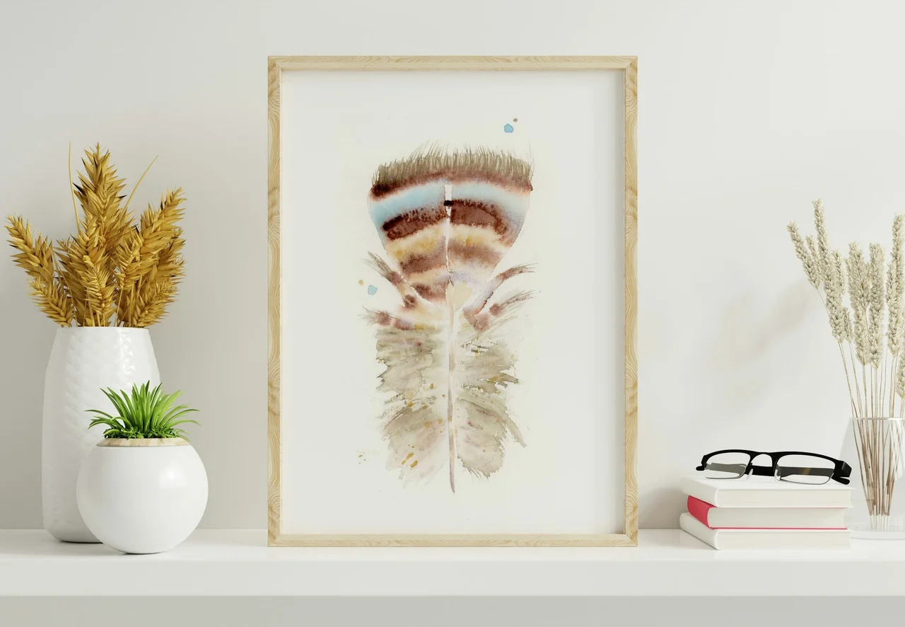In this piece, I used my hand-made Rocky Mountain #7 pigment to create soft, earthy tones of blue and brown, capturing delicate transitions and subtle blends. I carefully layered my brushstrokes to mimic the natural texture and fluidity of a feather, letting splatters and drips add a sense of spontaneity and authenticity. My goal was to invite you to connect with the serene beauty of nature, offering a quiet moment for reflection and understanding. — Shayna, July 2023