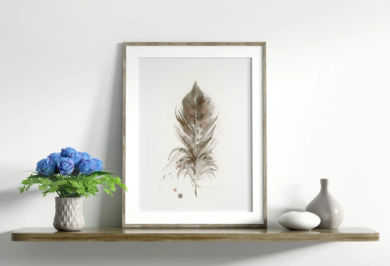 In this piece, I chose earthy tones of deep browns and soft grays, delicately blending them to create an elegant feather that seems almost alive. The intentional drips and splatters mimic nature’s imperfections, while the fluid brushstrokes suggest a gentle… read more