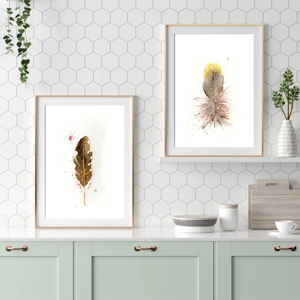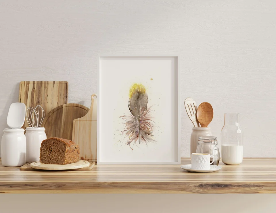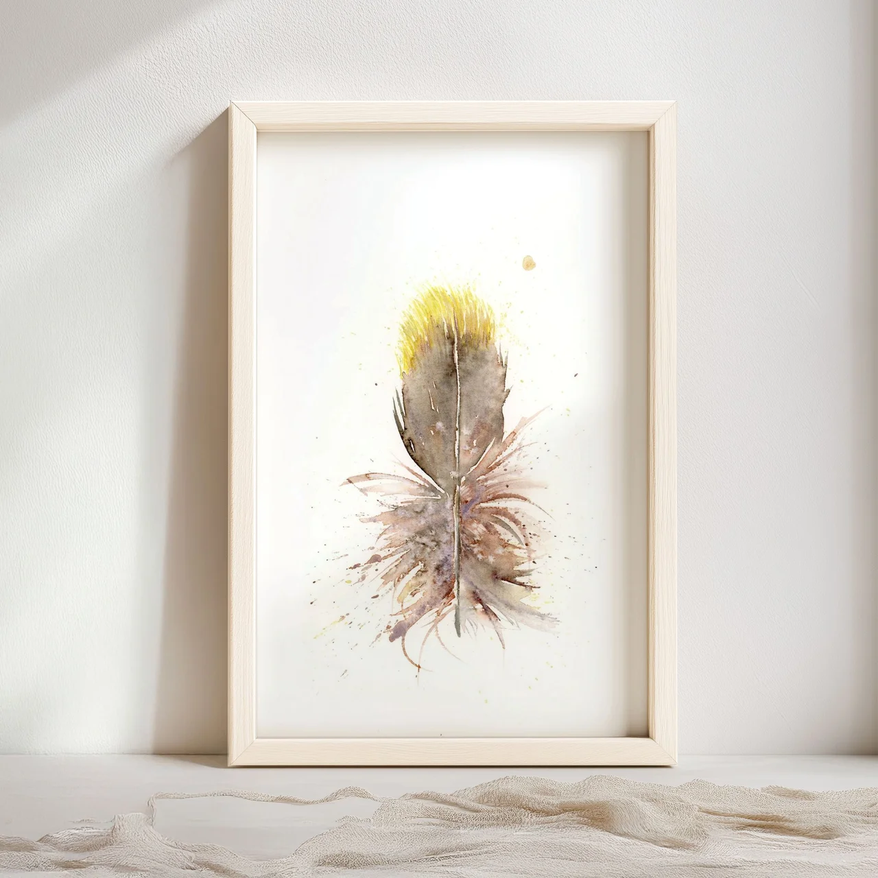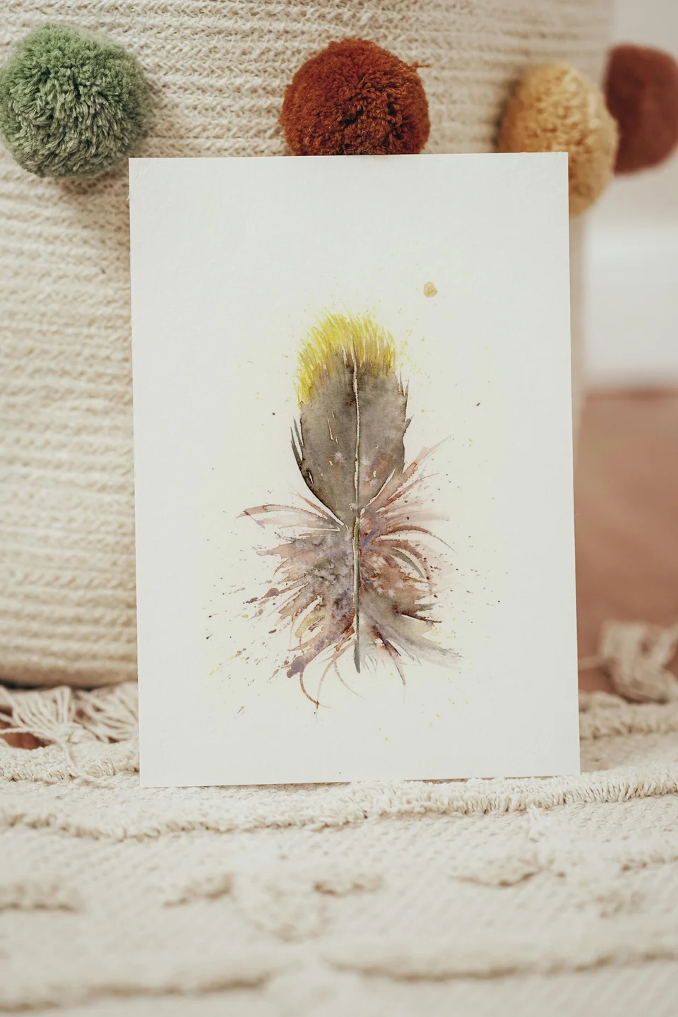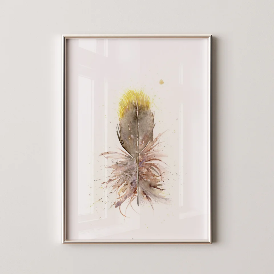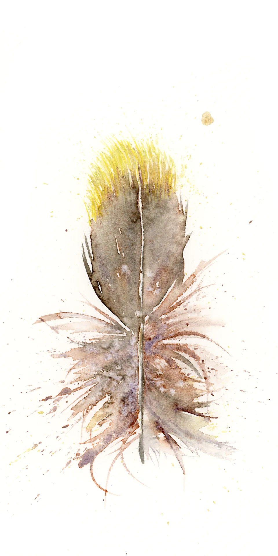 In this watercolor piece, I chose a palette of soft yellows and warm browns to gently guide the eye across the feather’s delicate structure. The fluid brushstrokes and subtle drips mimic the natural grace of the feather’s fibers, while the… read more