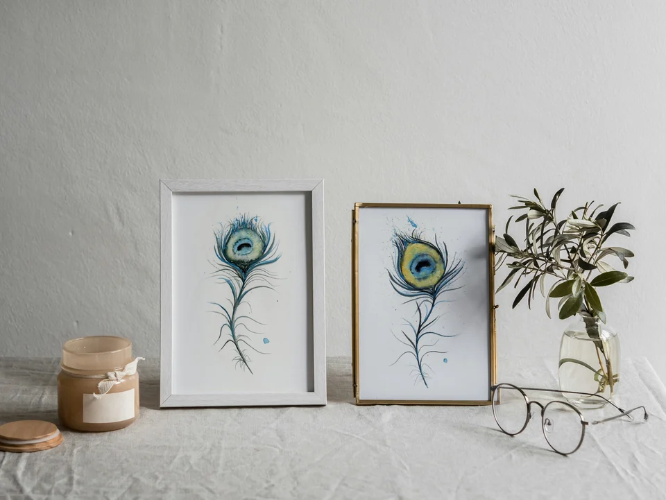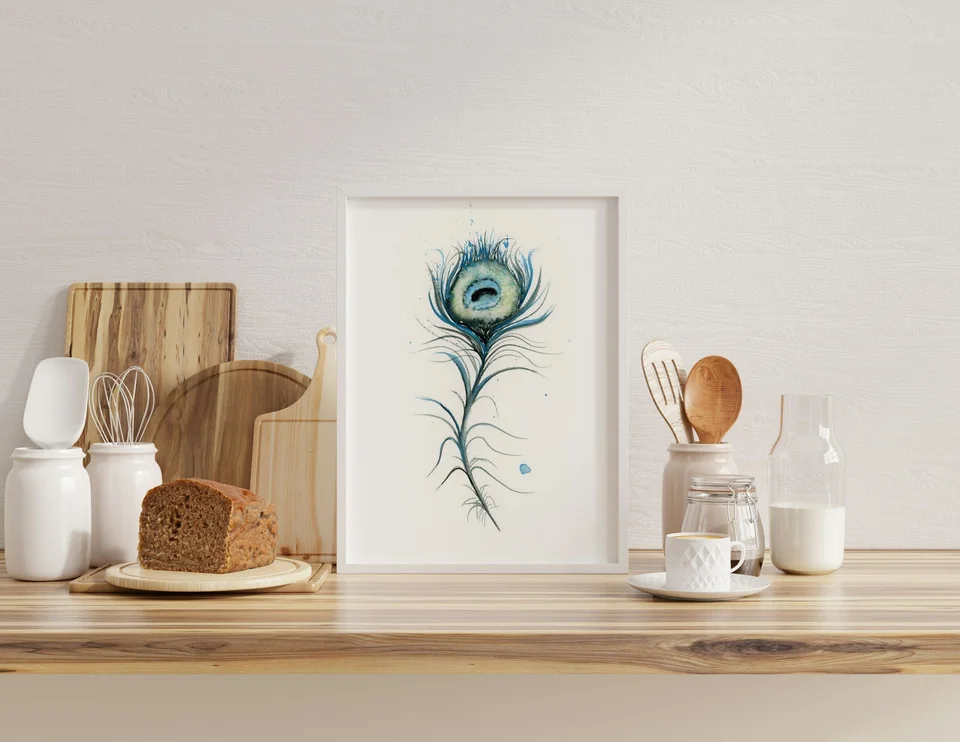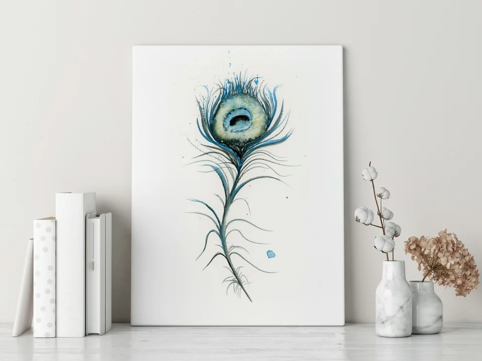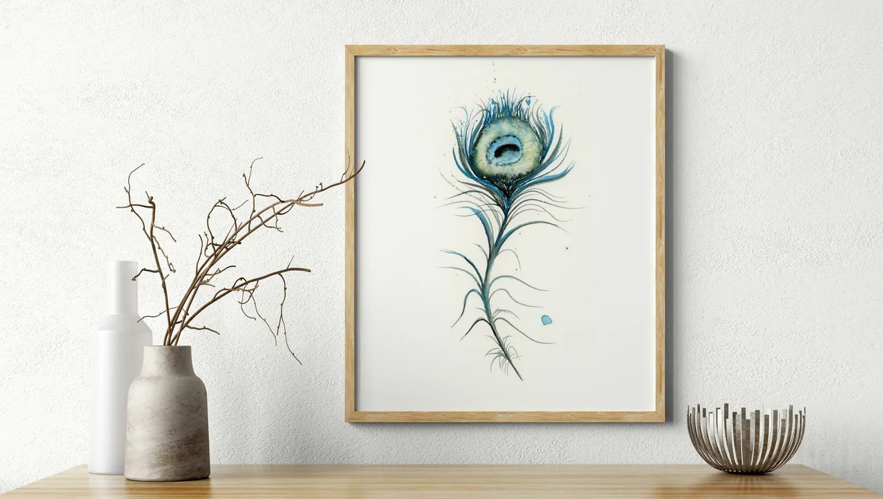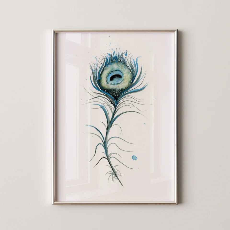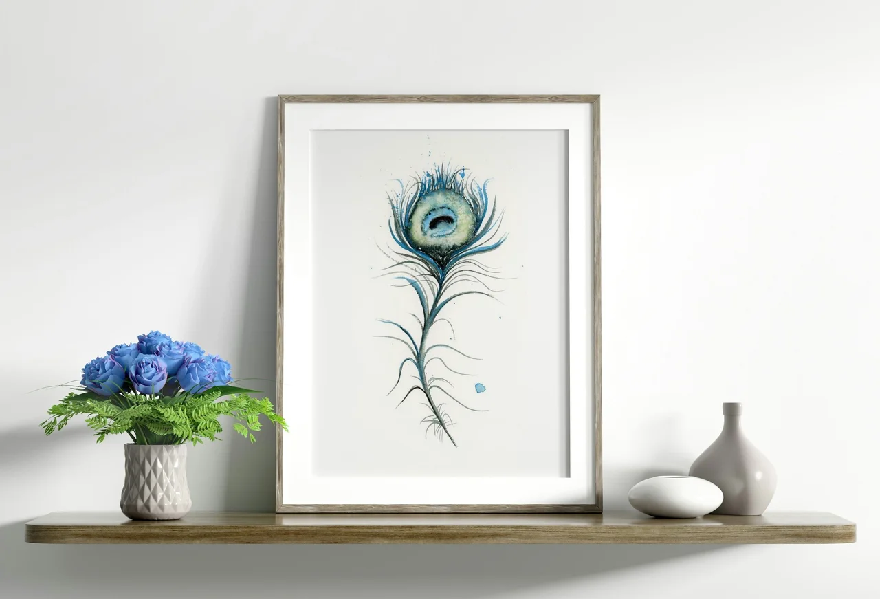 I wanted to capture a sense of serenity and harmony through delicate brushstrokes and a soothing palette. The cool blues and soft greens merge gently, creating an ethereal quality, while the subtle splatters and drips add a touch of spontaneity. Painting each curve and line of the peacock feather, I felt calm, knowing that the gentle flow and graceful shapes would evoke emotions of tenderness and unity. — Shayna, August 2023