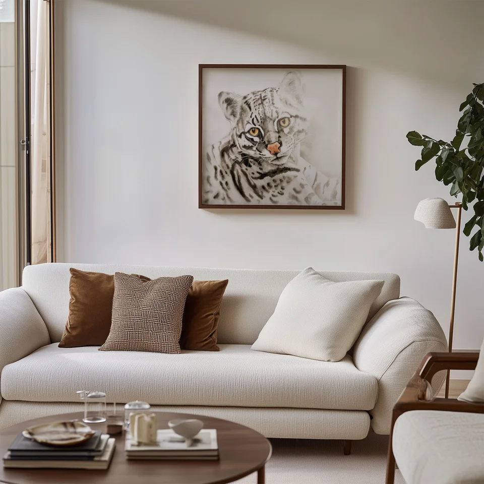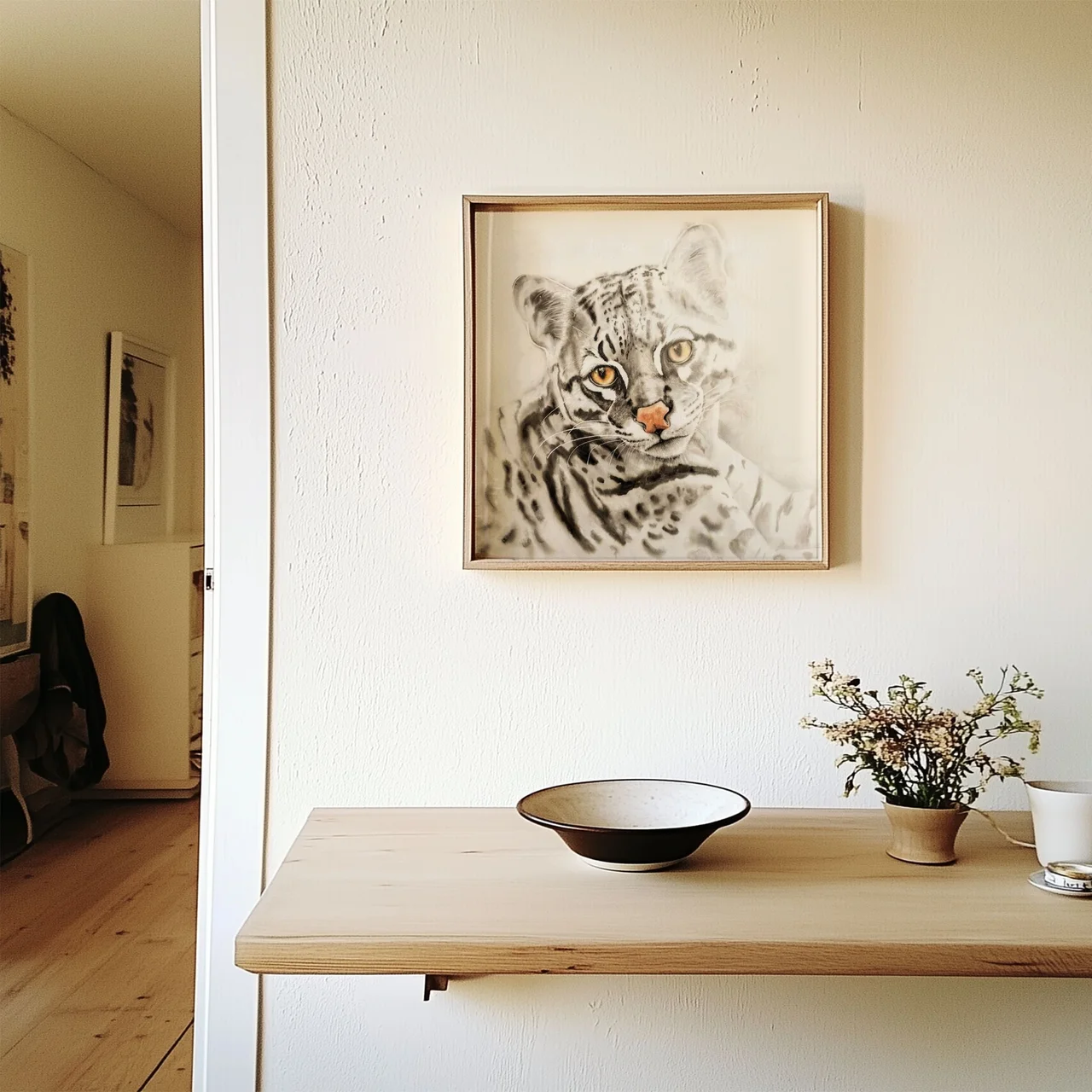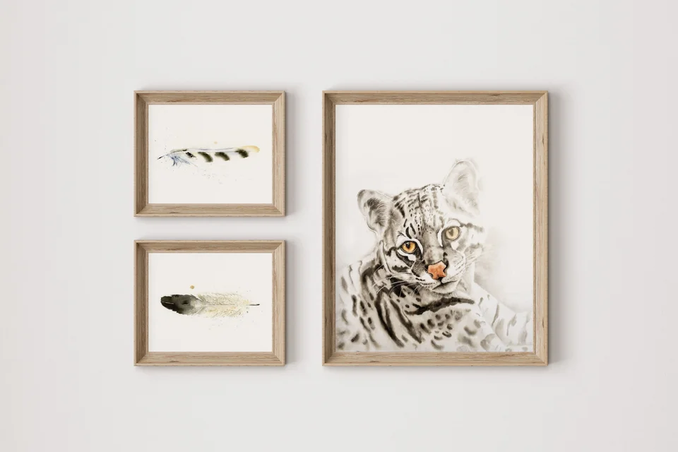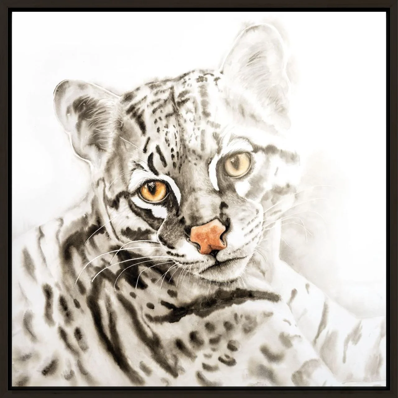 Commissioned for a family's newly remodeled home, this painting of an ocelot carries deep symbolism, making it a meaningful addition to their space. The ocelot, often regarded as a pathfinder, embodies guidance, intuition, and independence. In the wild, these graceful and determined creatures navigate their surroundings with precision, reminding us of the importance of trusting our instincts and confidently forging our own paths in life.