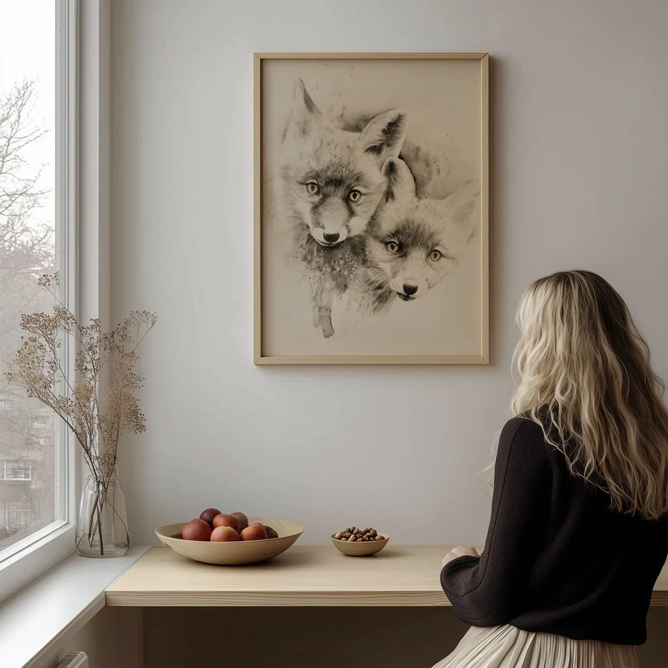 To me, these two little foxes became a symbol of life's seamless flow: how every moment, every ending, holds the beginning of something new. In their joy, I saw a reflection of companionship, the bond that forms when two souls are intertwined. Their playful energy inspired this painting, and I hope it brings the same warmth and light into your space that their presence brought into mine. —